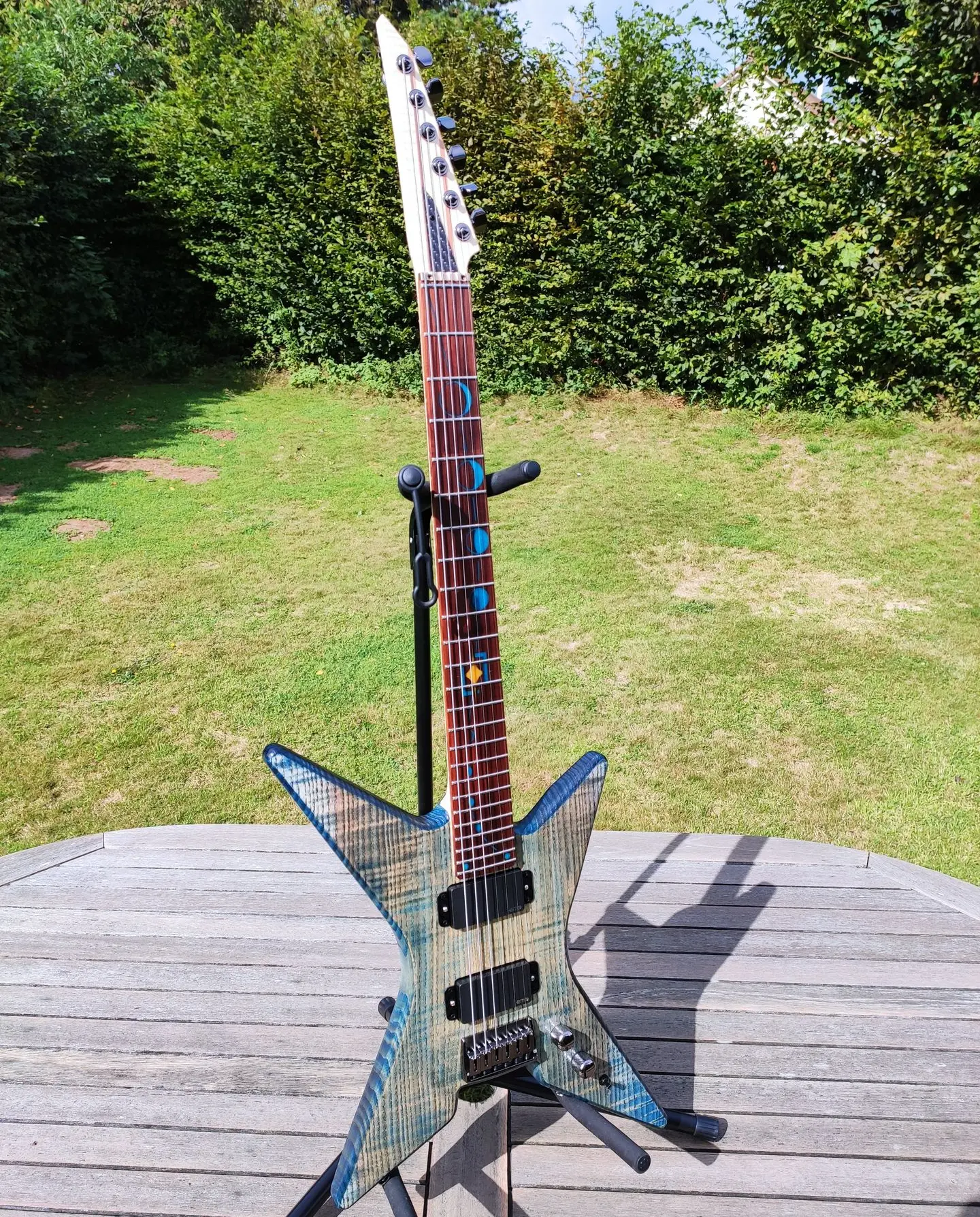 Nova Stella (nouvelle étoile en latin) est conçue avec des lignes épurées et une attention particulière au confort du guitariste. Légère par design (2.9kg), son manche vissé se fond dans le corps au niveau du talon, facilitant l'accès aux frettes supérieures. Sa tête "reverse", conjointement à sa frette zéro et son sillet guide-corde en laiton ajoutent une touche de modernité et contribuent efficacement à la précision des bends sur les cordes aigües. Par défaut, un accastillage GOTOH de qualité est monté sur l'instrument.